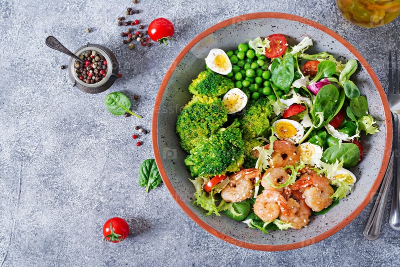 Здоровая салатная тарелка. Свежий рецепт морепродуктов. Жареные креветки и свежий овощный салат, яйца и брокколи. Жаренные креветы. Здоровая еда. Плоская ложка. Вид сверху