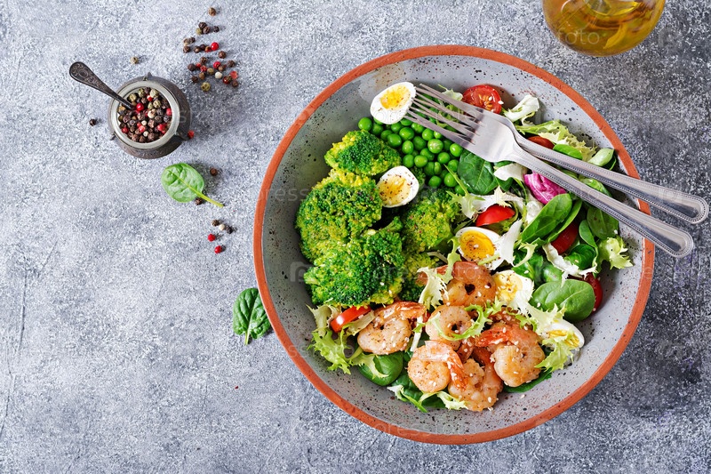 Здоровая салатная тарелка. Свежий рецепт морепродуктов. Жареные креветки и свежий овощный салат, яйца и брокколи. Жаренные креветы. Здоровая еда. Плоская ложка. Вид сверху