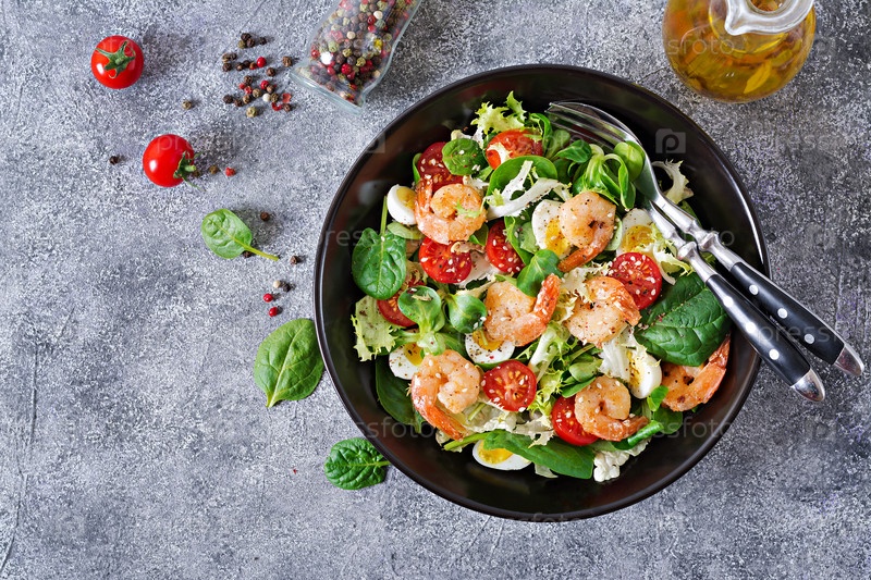 Здоровая салатная тарелка. Свежий рецепт морепродуктов. Жареные креветки и свежий овощный салат и яйцо. Жаренные креветы. Здоровая еда. Плоская ложка. Вид сверху