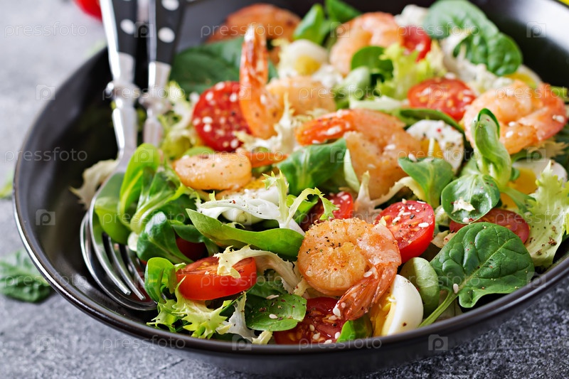 Здоровая салатная тарелка. Свежий рецепт морепродуктов. Жареные креветки и свежие овощные салаты с яйцами. Жареный креветок. Здоровое питание