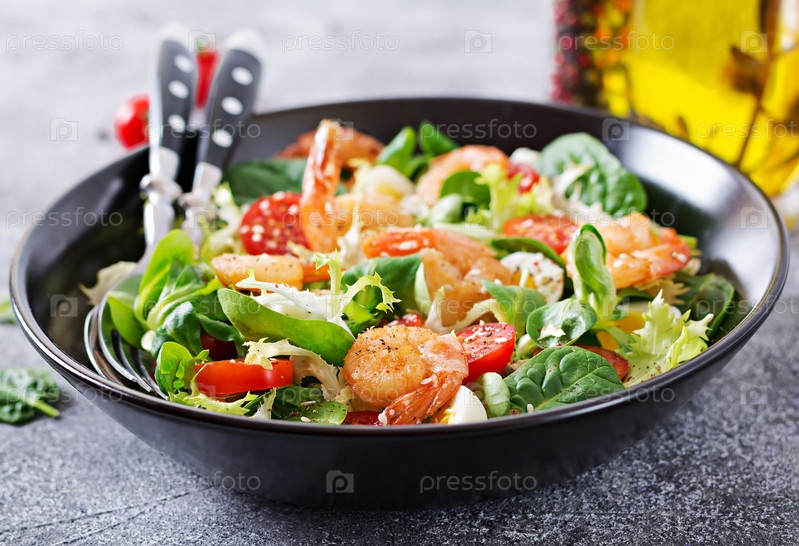 Здоровая салатная тарелка. Свежий рецепт морепродуктов. Жареные креветки и свежие овощные салаты с яйцами. Жареный креветок. Здоровое питание