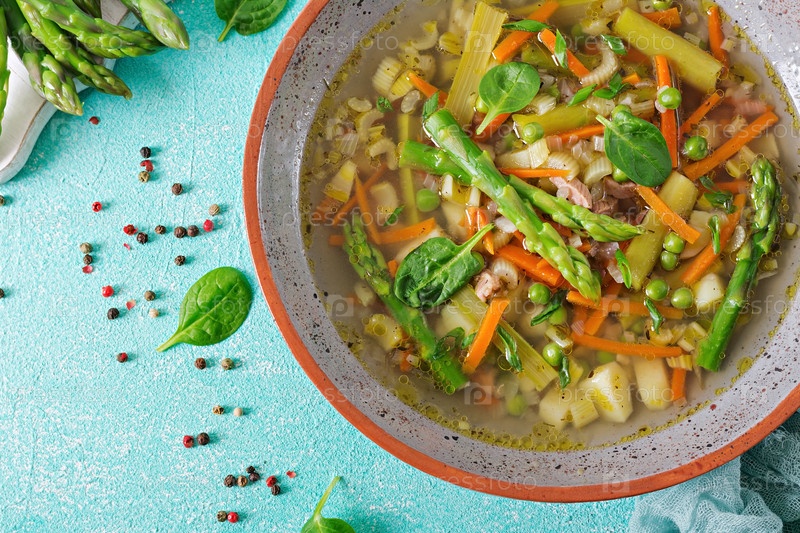 Суп с говядиной, спаржами, зеленым горохом, морковью и сельдерем. Диетическое меню. Здоровая пища. Плоская ложка. Вид сверху