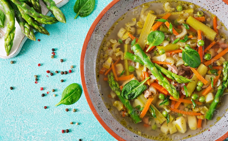 Суп с говядиной, спаржами, зеленым горохом, морковью и сельдерем. Диетическое меню. Здоровая пища. Плоская ложка. Вид сверху