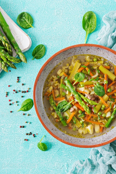 Суп с говядиной, спаржами, зеленым горохом, морковью и сельдерем. Диетическое меню. Здоровая пища. Плоская ложка. Вид сверху