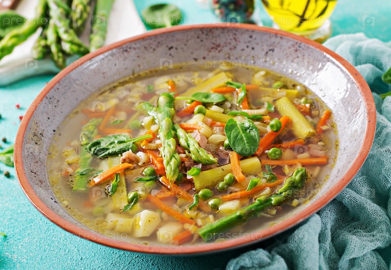 Суп с говядиной, спаржами, зеленым горохом, морковью и сельдерем. Диетическое меню. Здоровая еда