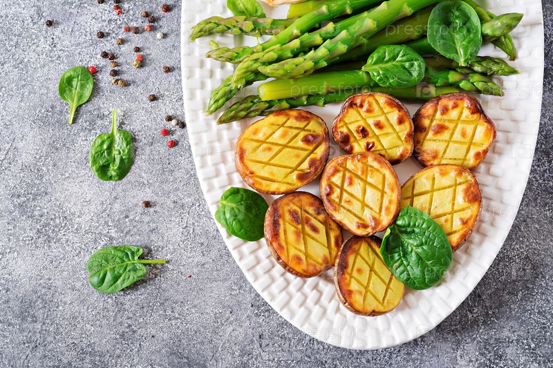 Половины запеченных картофелей и спаржи. Диетическое меню. Здоровая еда. Веганская кухня. Плоский слой. Вид сверху