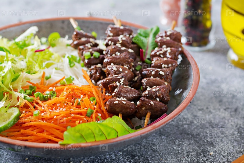 Куриные сердца в пряном соусе, лапша и овощный салат