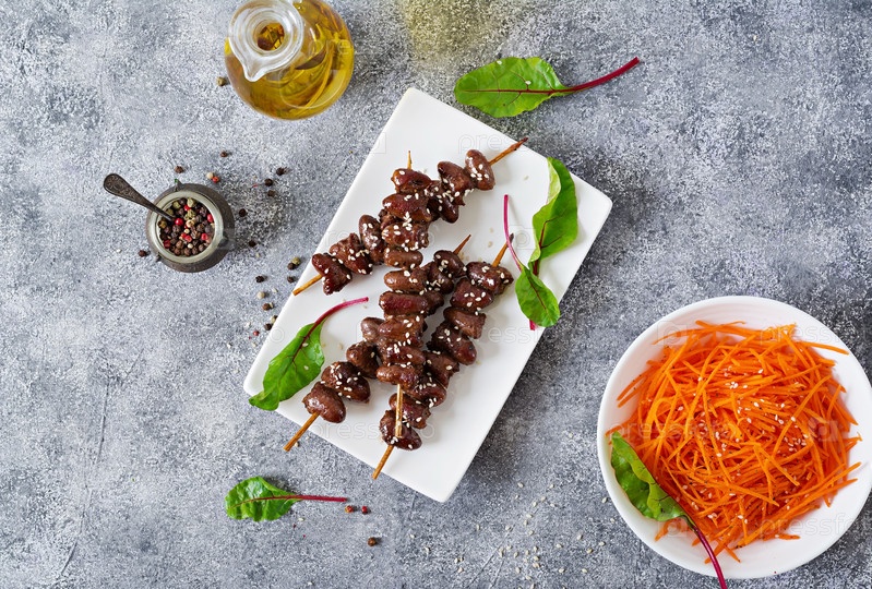 Куриные сердца в пряном соусе и морковный салат. Здоровая еда. Вид сверху