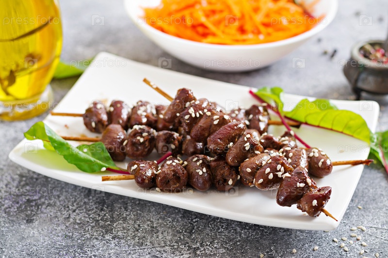 Куриные сердца в пряном соусе и морковный салат.Здоровая еда