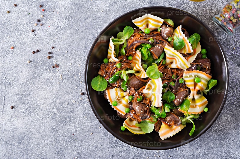 Куриные сердца с морковью в кисло-сладком соусе с макаронами фарфале. Здоровый салат. Вид сверху. Плоская ложка