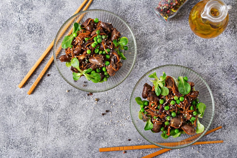 Куриное сердце с морковью, луком и зеленым горохом в азиатском стиле