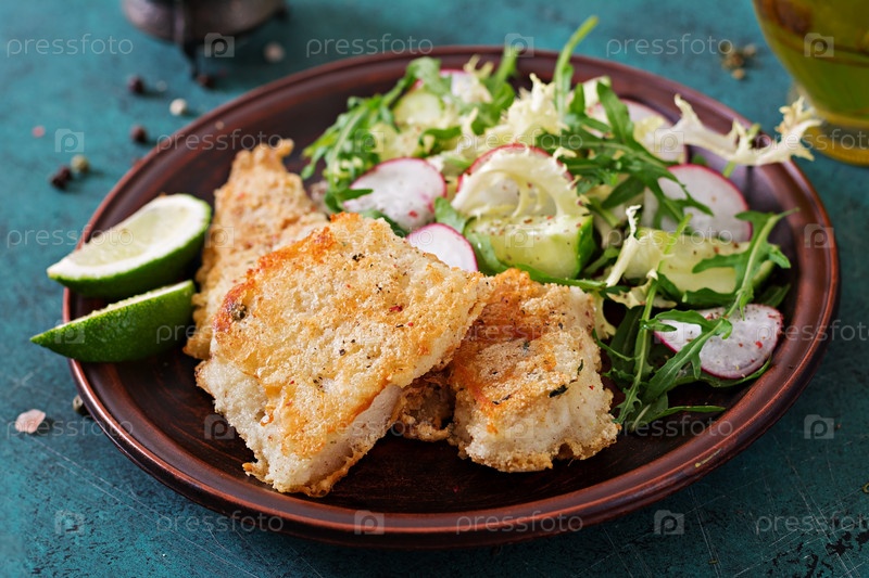 Жареное белое рыбное филе и салат с огурцами и редисами