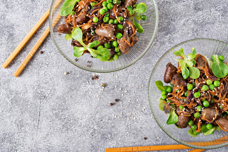 Куриное сердце с морковью, луком и зеленым горохом в азиатском стиле