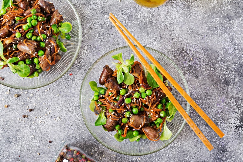 Куриное сердце с морковью, луком и зеленым горохом в азиатском стиле