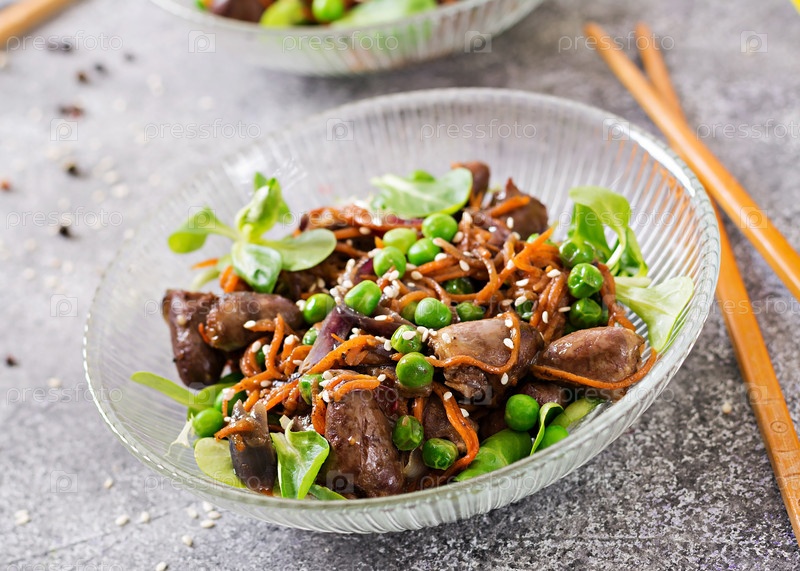 Куриное сердце с морковью, луком и зеленым горохом в азиатском стиле