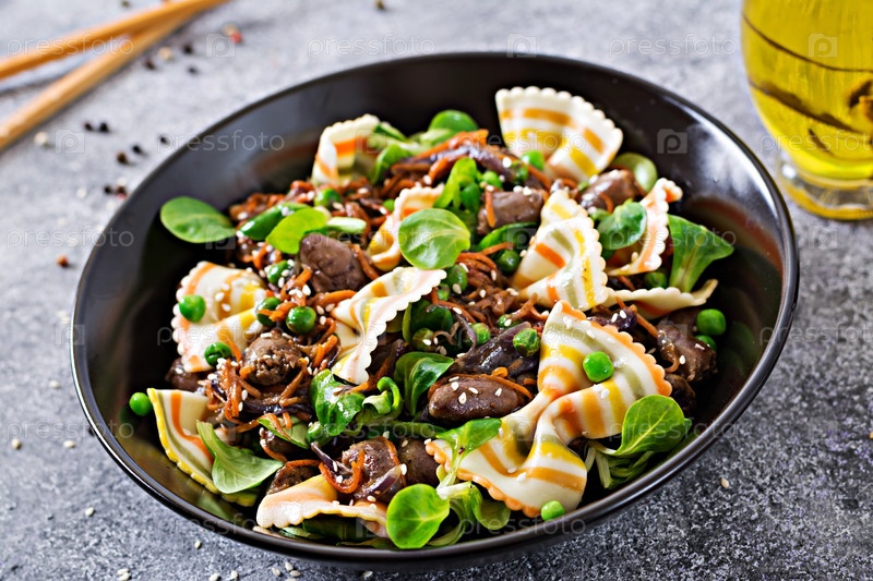 Куриное сердце с морковью в кисло-сладком соусе с макаронами Farfalle
