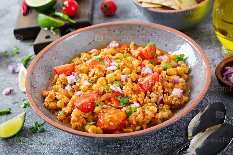 Chili con carne of turkey with chickpeas served with nachos. чили с мясом, начос, лаймом, пряным перцем. мексиканская / техасская традиционная еда