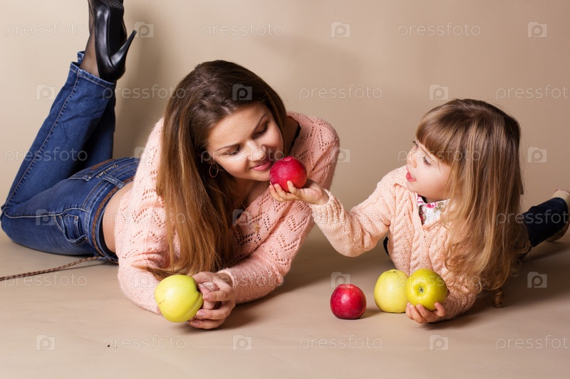 Молодая мать с ее маленькая дочь с яблоками