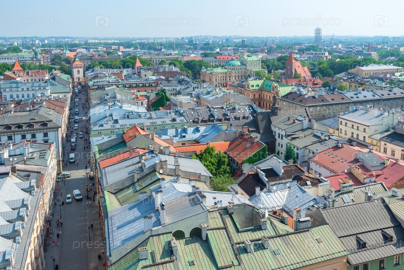 Улица Флориана и Фторианские ворота в центре Кракова, вид на город сверху