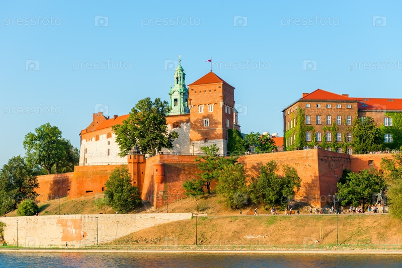 Краков, Польша - 11 августа 2017 года: кирпичный средневековый красивый замок Вавел на берегу реки Висла в Кракове