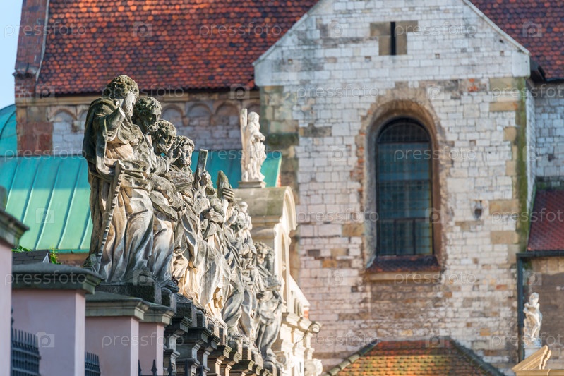 Скульптура 12 апостолов на фоне католической церкви в Кракове
