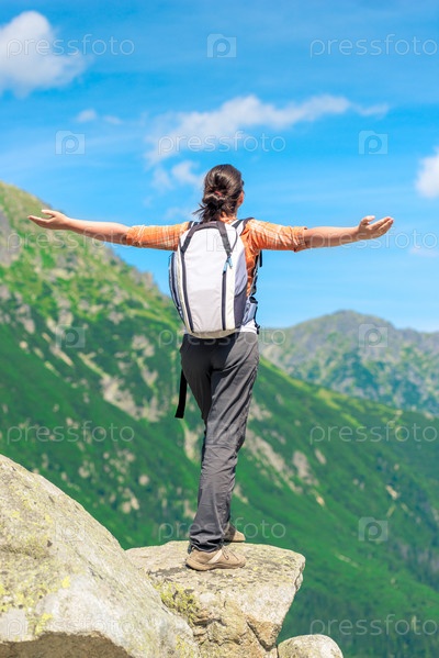 Счастливый турист стоит у обрыва на краю скалы с распростертыми руками в сторону
