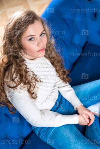 Портрет красивой молодой девушки в теплом свитере и джинсах на диване