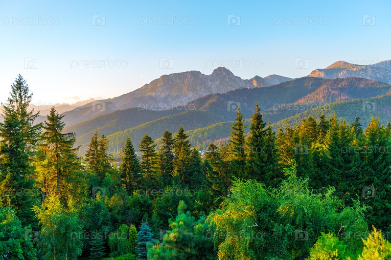 Вершины гор с густым хвойным лесом в лучах утреннего солнца с летним фенхелем