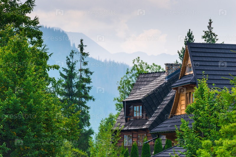 Крыша виллы в лесу с видом на высокие горы