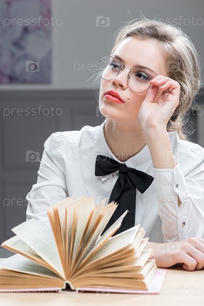 Портрет мечтательной молодой женщины в стильных очках с книгой