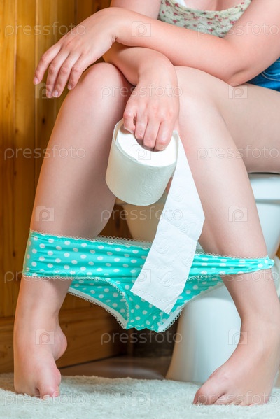 Девушка со спущенными трусами с туалетной бумагой на унитазе