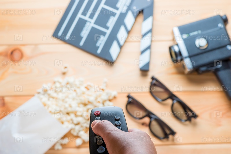 На фоне киноиндустрии объекты дистанционного управления от телевизора в женской руке