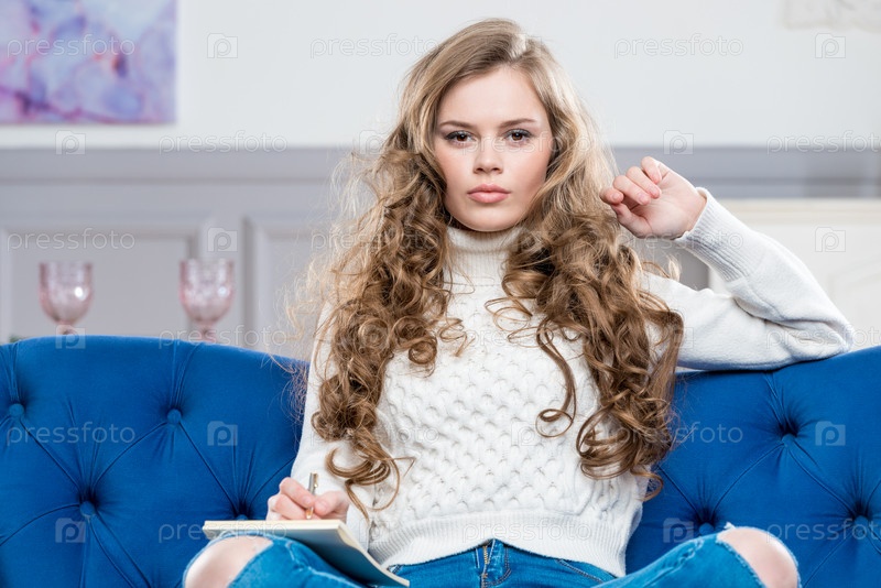 Красивая молодая модель с коробкой на диване позирует