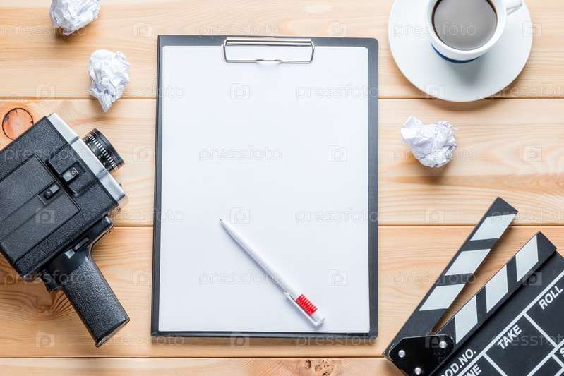 Ноутбук для записей, свернутые листы и видеокамера для съемки фильма лежат на деревянных досках