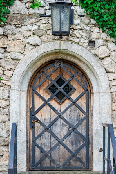 Деревянная дверь с металлической решеткой в средневековом здании, фонарь над входом