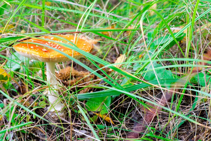 Ядовитый гриб аманита с оранжевой шляпой на зеленой траве в лесу крупный план