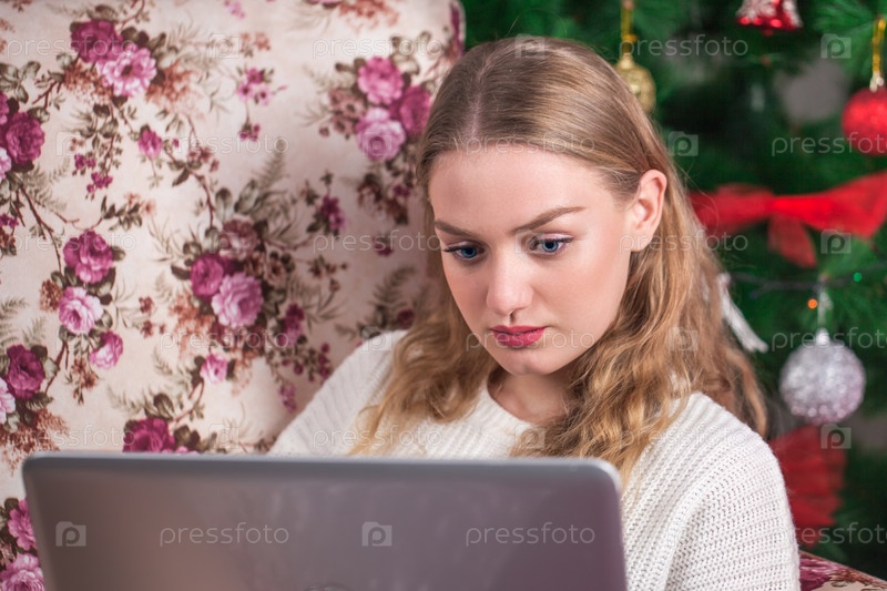 Красивая девушка с ноутбуком.Рождество, время чудес