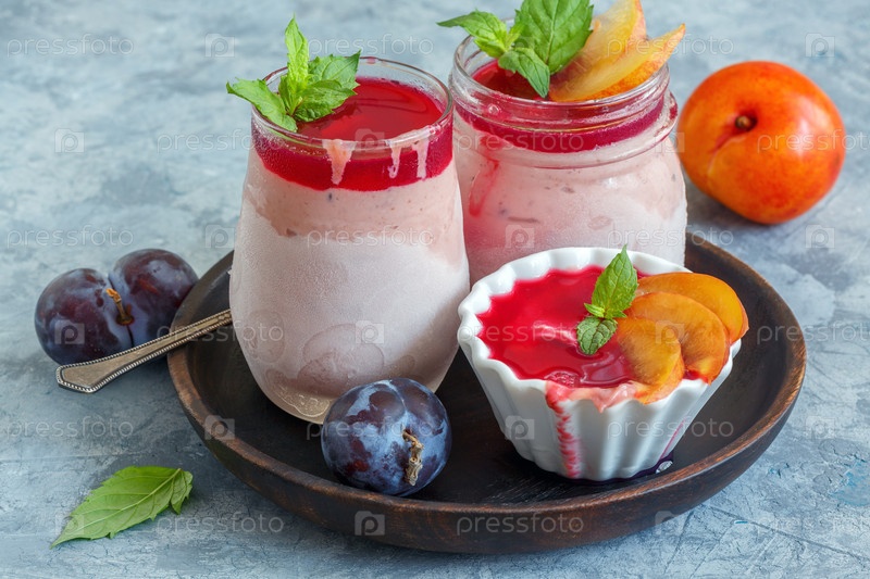 Банки с домашним сливовым мороженым и мятовыми ветвями