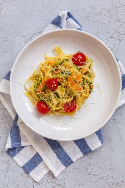 Лингвиновую пасту с полосками кабачка и моркови
