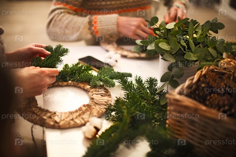 Обрезанный вид рук цветочника, делающих рождественский венок из деревянных веток
