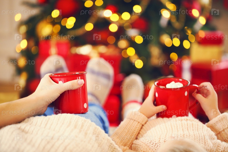 Горячий шоколад с зефиром в руках счастливой женщины и ее дочери у рождественской елки