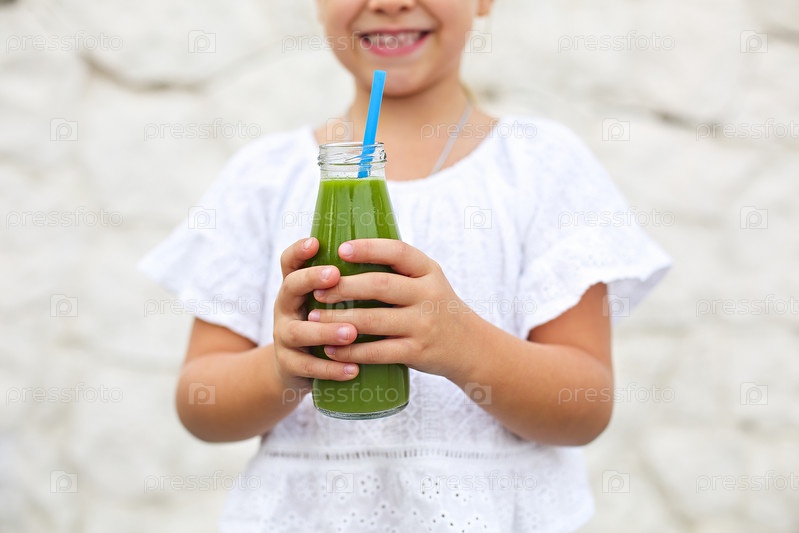 Маленькая девочка пьет зеленый свежий сок, используя соломинку на улице