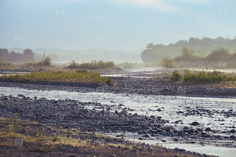 Восход солнца над горной рекой утром