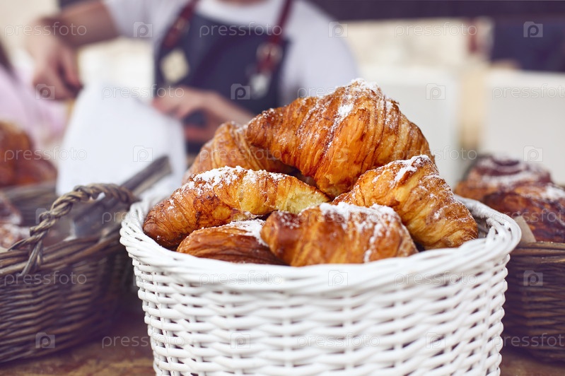 Молодой человек-бариста, принимающий круасан с помощью щипцов в кафе