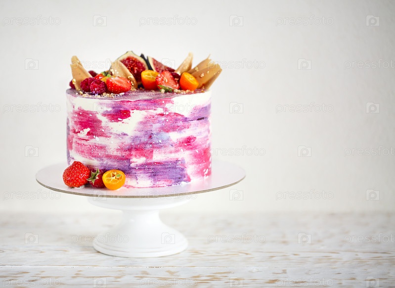 Красивый яркий торт на фарфоровом тортном стенде, украшенном фруктами
