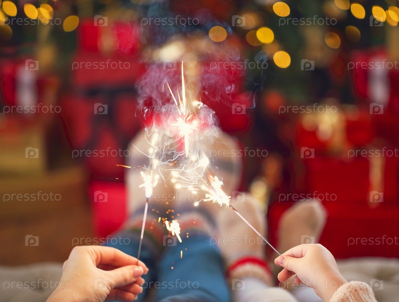 Счастливая семья с бенгальскими огнями на рождественском фоне
