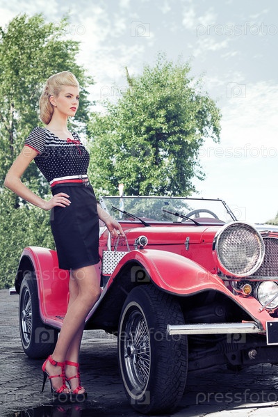 Элегантная девушка позирует возле ретро автомобиля