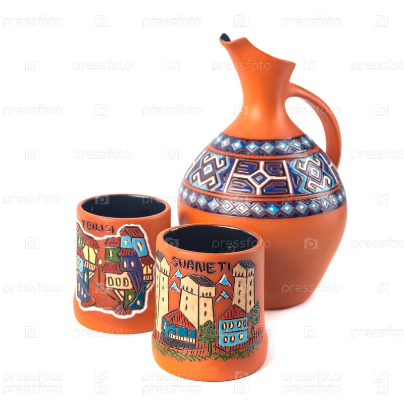 Грузинский ручной работы керамический (глиняный) кувшин с традиционными орнаментами на нем, названный Doqi, и чашка под названием tasi для вина и воды на белом фоне