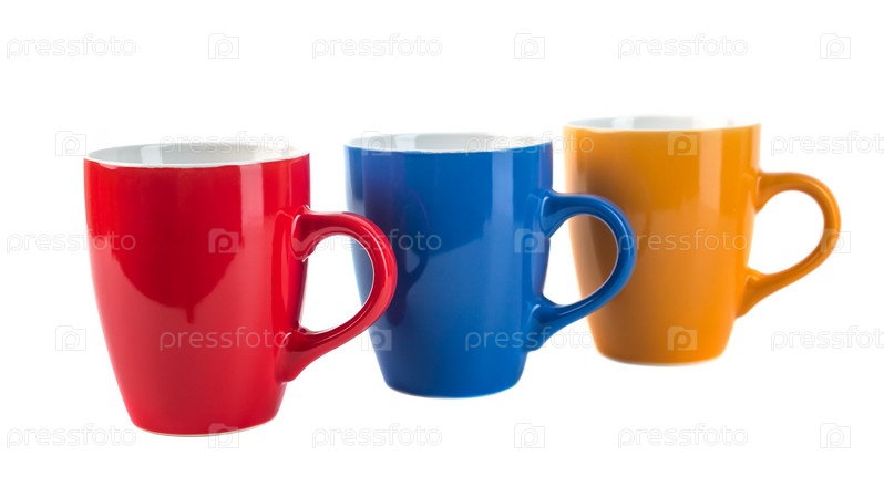 Три цветные керамические чашки на белом фоне
