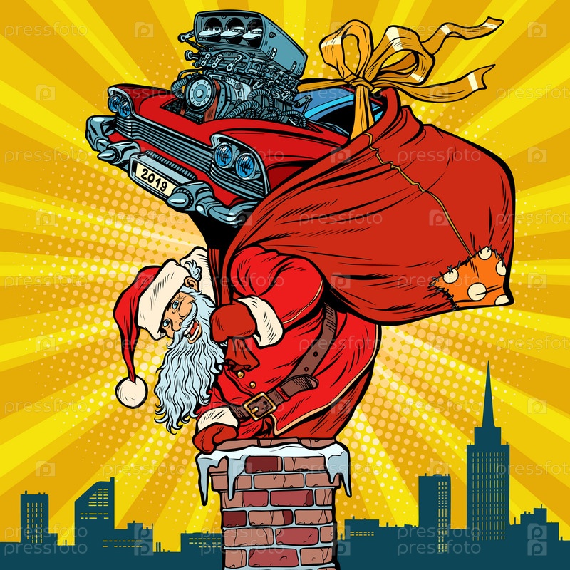 Ретро гоночная машина.Санта Клаус с подарками поднимается в дымоход